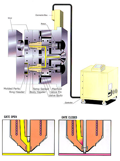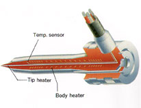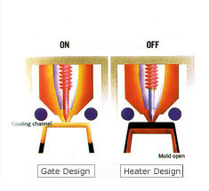 An internal body heater maintains the melt temperature of resin around the probe. A separate tip heater turns “ON” to melt the gate open. Cooling holes near the gate areas always keep both the cavity and gate areas evenly cooled. When the tip heater turns “OFF”, the gate area is cooled down by heat transfer, and the resin in the gate area is rapidly solidified, sealing the gate.