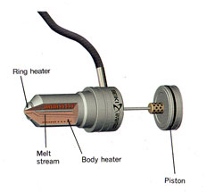 The spear has a double heater structure consisting of a tip heater and a body heater. The spear tip has been modified to directly heat itself. There are a large variety of spears available to accommodate different resin types and applications.